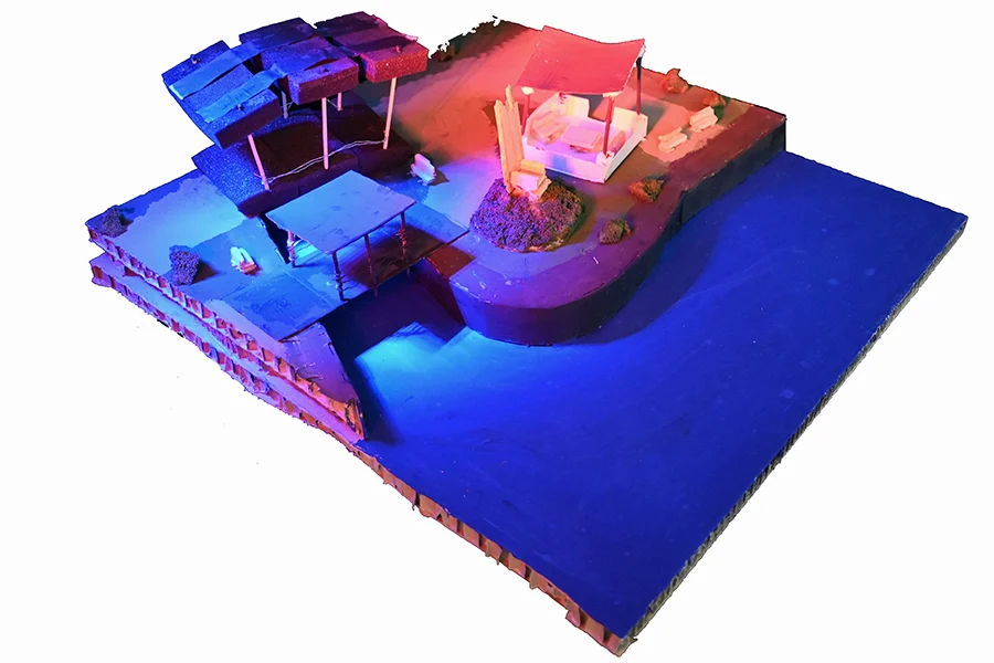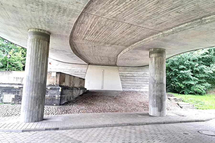 Station 1 Raum unter der Langen Brücke Der Raum unter der Brückenzufahrt Lange Brücke ist gut gestaltet: verschiedene reliefartige Oberflächenstrukturen im Sichtbeton geben dem Ganzen eine gewisse Ästhetik. Sehr anregend sind die Kurvenlinie der Fahrbahn, eine bestehende Terrasse, die Raumbildung selbst. Projekt 1 baut den Naturaspekt des Freiraums aus. Projekt 2 baut in den Raum einen Club.
