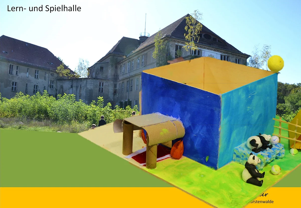 Die Stadt Fürstenwalde entwickelt aktuell Nutzungsideen für die historische Aufbauschule (Bj. 1918), etwas außerhalb des Stadtkerns direkt angrenzend an den Tierpark und die temporär genutzte „Festwiese“ gelegen. Die SchülerInnen der Sonnengrundschule/ Klasse 4a erweitern mit diesem Projekt den Ideenpool um ihre eigenen Ideen. Auf der Grundlage tatsächlicher Planunterlagen aus dem Bauarchiv konnten sie sich mit dem Gebäudeensemble oder dem umliegenden Freiraum (oder beidem) beschäftigen.