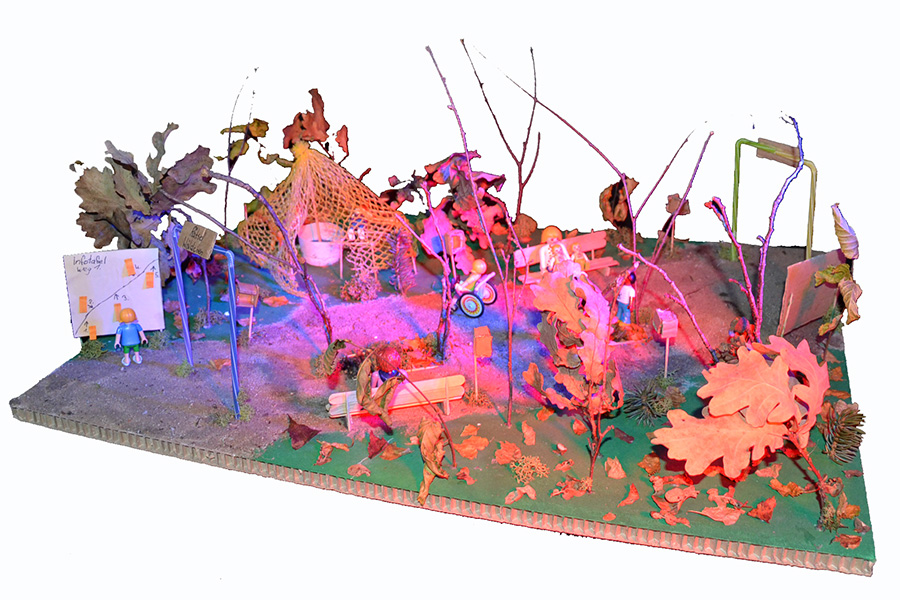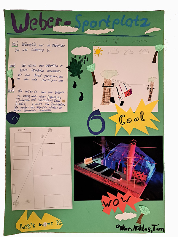 Wir haben die Schüler:innen im Unterricht gefragt, welche Orte sie in Babelsberg als schön und angenehm oder umgekehrt als unangenehm und verbesserungswürdig empfinden. Positiv genannt wurden diese Orte: Strandbad, Flatowturm, Nowawiese, Lindenpark, Park Babelsberg, Friedrichskirche, Karli (Eismaschine). Und als negativ und verbesserungswürdig wurden diese Orte gesehen: S-Bahnhof Babelsberg, Weberplatz, Schulhof, S-Bahn-Brücke, Sandscholle Umkleiden, Gammelspielplatz. Aus der Negativreihe haben wir den Weberplatz (Station 1) und den S-Bahnhof Babelsberg (Station 2) ausgewählt und noch einen anderen Ort in der Nähe der Schule ergänzt: das Wäldchen an der Rudolf-Breitscheid-Straße (Station 3). Aufgabe für die Schüler:innen war es, einen dieser 3 Orte mit gestalterischen Mitteln zu verbessern und den Entwurf in Modell, Skizzen und Plakaten darzustellen. Der Projekttitel wurde in der Klasse in einer mehrheitlichen Abstimmung gefunden: Die Stadt von morgen.