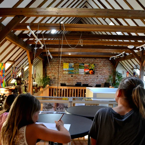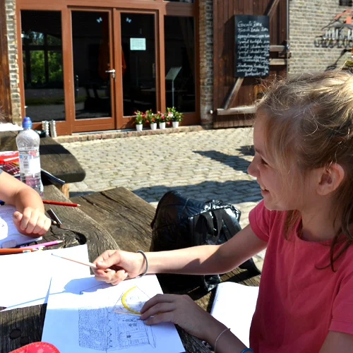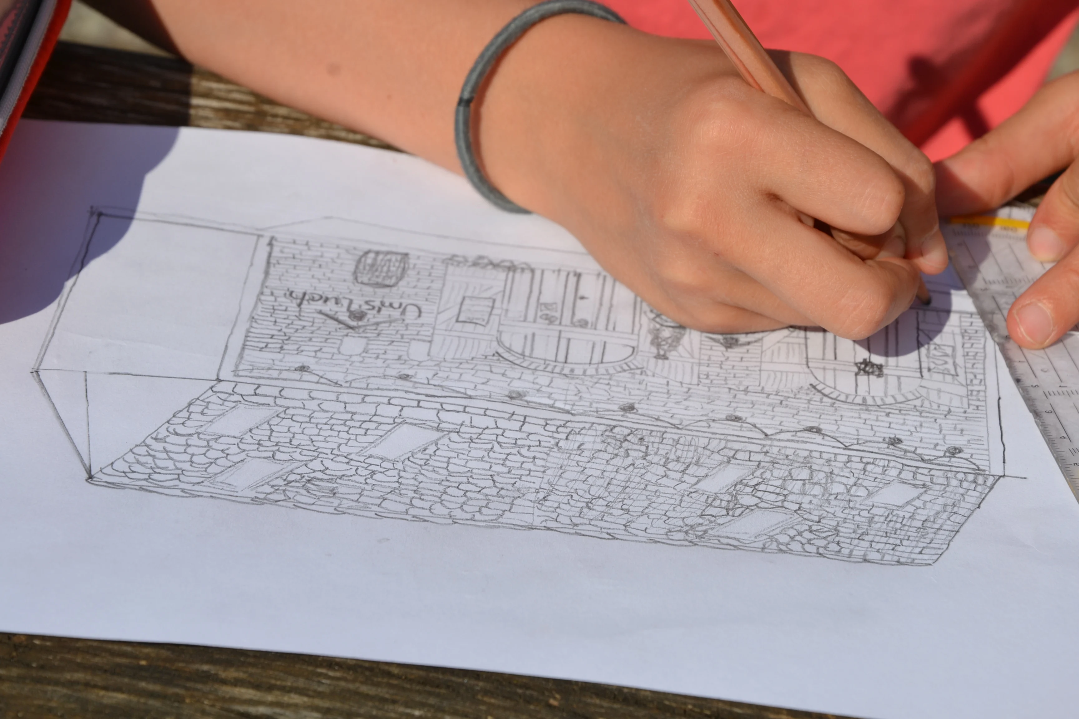 Nach dem Besuch beim Bürgermeister, einem Stadtrundgang und der Besichtigung mehrerer Scheunen mit unterschiedlichen Nutzungen (Scheunenmuseum, Restaurant, Ferienwohnung) haben wir als Vorbereitung der Projektwoche einen ganzen Vormittag lang nur im Scheunenviertel gezeichnet. Diese „altmodische“ und eher ungewohnte Methode schult die Wahrnehmung, konzentriert die Aufmerksamkeit auf räumliche Zusammenhänge oder das Detail, auf Proportionen, Strukturen und Farben. Einige Kinder haben später im Stadtentdecker-Gespräch klar formuliert, das Zeichnen hätte ihnen geholfen, die Elemente einer Scheune wie Dachkonstruktion, Mauerwerk oder Torbogen zu begreifen und auch überhaupt erst bewusst zu sehen- dadurch seien sie auf ihre Projektidee gekommen. Vielen Modellen sieht man die Auseinandersetzung mit dem Thema Konstruktion und Innenraum auch tatsächlich deutlich an.