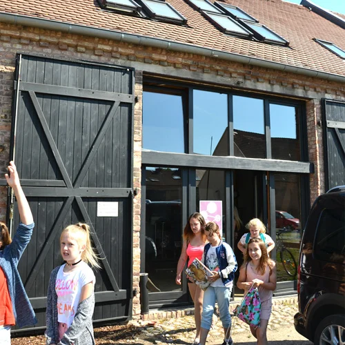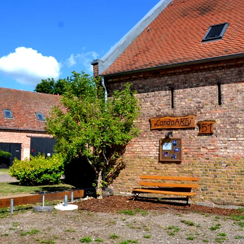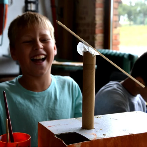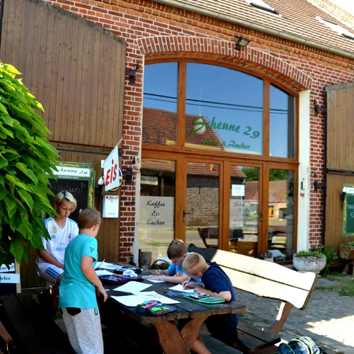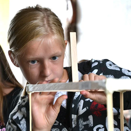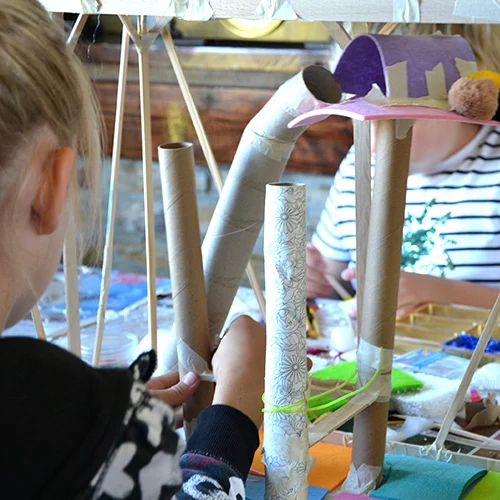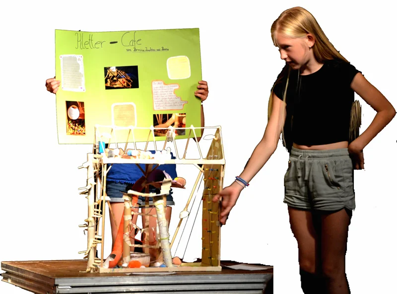 Mit Modellen und Präsentationsplakaten haben die Kinder ihre Ideen dann in 9 Projekten umgesetzt. Die Scheunen werden als Jump-Haus, Eis-Kino, Multi-Scheune, Pferde- und Hundeladen, Das Verrückte Geisterlabyrinth und Kletterhalle genutzt (viele mit Elterncafé), am Teich entstehen ein Landparty-Café und eine neue Brücke. An den Modellen ist ganz deutlich der Einfluss zu erkennen, den das zur Verfügung gestellte Modellbaumaterial haben kann. In diesem Fall haben wir, um die Beschäftigung mit der Holzkonstruktion der Scheunendächer zu fördern, feine schmale Holzprofile aus dem Baumarkt organisiert.