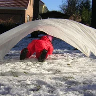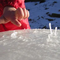 Das Klima und die natürlichen Rohstoffvorkommen eines Ortes stehen seit jeher in direktem Zusammenhang mit dem Bauen von Behausungen und Konstruktionen. Sie haben Einfluss auf Materialwahl, Konstruktion, Statik, Form, Gestalt, Bauprozess, Haltbarkeit und Funktion und sind somit wesentlich beteiligt am Bauprozess und am Ergebnis. Die Möglichkeiten und Erkenntnisse, die sich daraus im Winter ergeben können, werden in der Experimentreihe „Eisschalen“ getestet. Sie vermittelt spielerisch konstruktive und architektonische Prinzipien und lässt ganz nebenbei die kalten Außentemperaturen im Spiel vergessen. Wasser ist ein zunächst unerwartetes Baumaterial und dadurch besonders reizvoll. Durch die Veränderung der Aggregatzustände können vielfältige physikalische Beobachtungen gemacht werden, die direkte Auswirkungen auf den aktuellen Bauzustand haben. Beim Bau selbst spielen viele Faktoren eine Rolle: man muss sich handwerklich auf das Material Wasser einstellen, Erfahrungen in der Gruppenarbeit einsetzten und sich mit dem Bauprozess auseinandersetzen. Durch die kalten Außentemperaturen entsteht schnell der Wunsch nach einem schnelleren, optimierten Bauablauf.