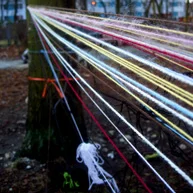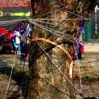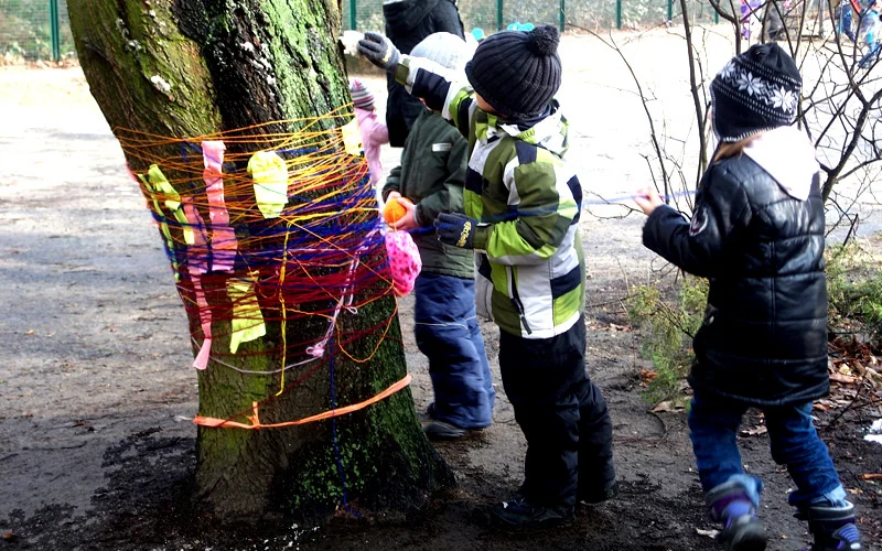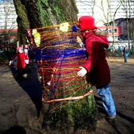 Diese notwendigen Maßnahmen haben wir mit den 14o Kindern der Kita in einer feierlichen „Baumverabschiedung“ inszeniert. Dazu haben wir die zuerst entsprechenden Bäume mit einer langen Kinderschlange singend umrundet, und anschließend mit meterlangen Wollfäden verbunden, verknüpft, verknotet, vernetzt, verkreuzt und verschränkt. Die Kinder haben den Bäumen dann kleine Briefe und Wunschzettel mit auf den Weg gegeben und sich mit Baum- und Naturliedern verabschiedet.