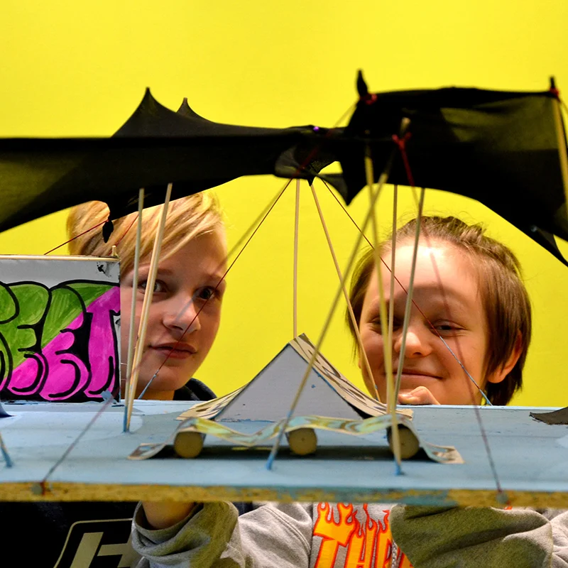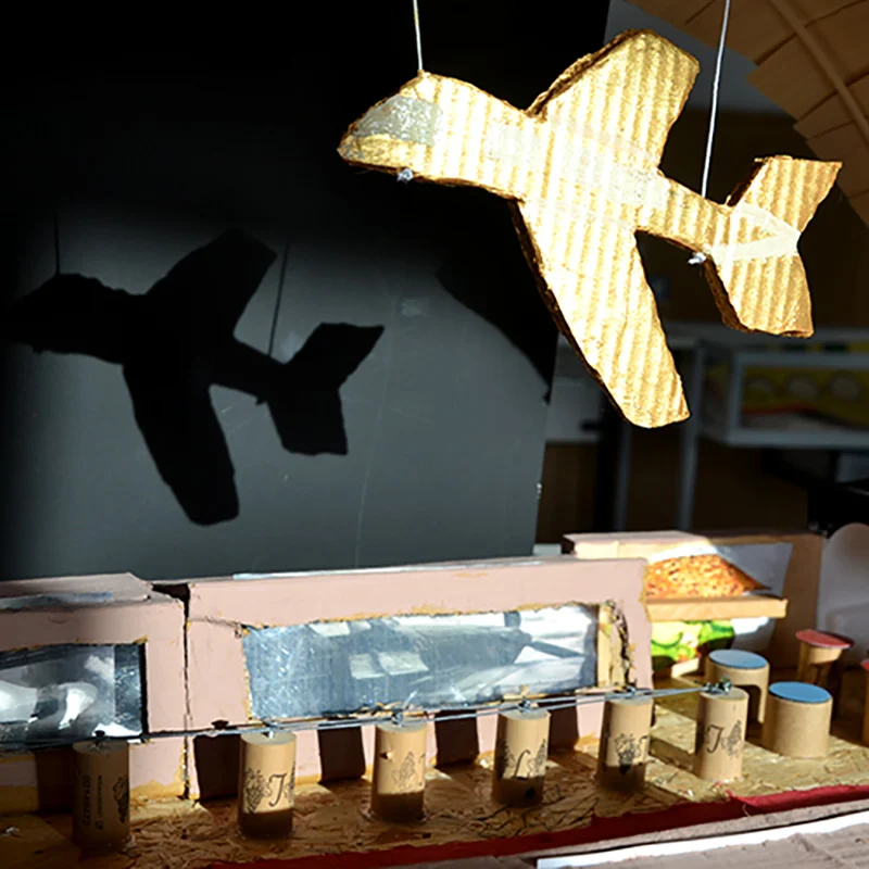 Wir haben uns daher die Aufgabe gestellt, das Gelände mit neuem Leben zu füllen und kind- und jugendgerechte Nutzungen für die vorhandenen Baustrukturen zu entwickeln. Die unterschiedlichen phantasieanregenden ehemaligen Flugzeughangars und die teilweise gut erhaltenen Backsteingebäude auf dem Gelände haben wir in einem Stadtspaziergang gemeinsam mit Schönwalde-Gliens Bürgermeister Bodo Oehme erkundet, der auch von der geplanten Nutzung als Wohnquartier für etwa 3.750 Bewohner*innen berichten konnte. Direkt aus dieser Inspiration wurden in der anschließenden Arbeitsphase in der Schule in 7 Gruppen ganz unterschiedliche Projekte entwickelt, die im Modellbau, in Skizzen und Fotos anschaulich bearbeitet und umgesetzt wurden.