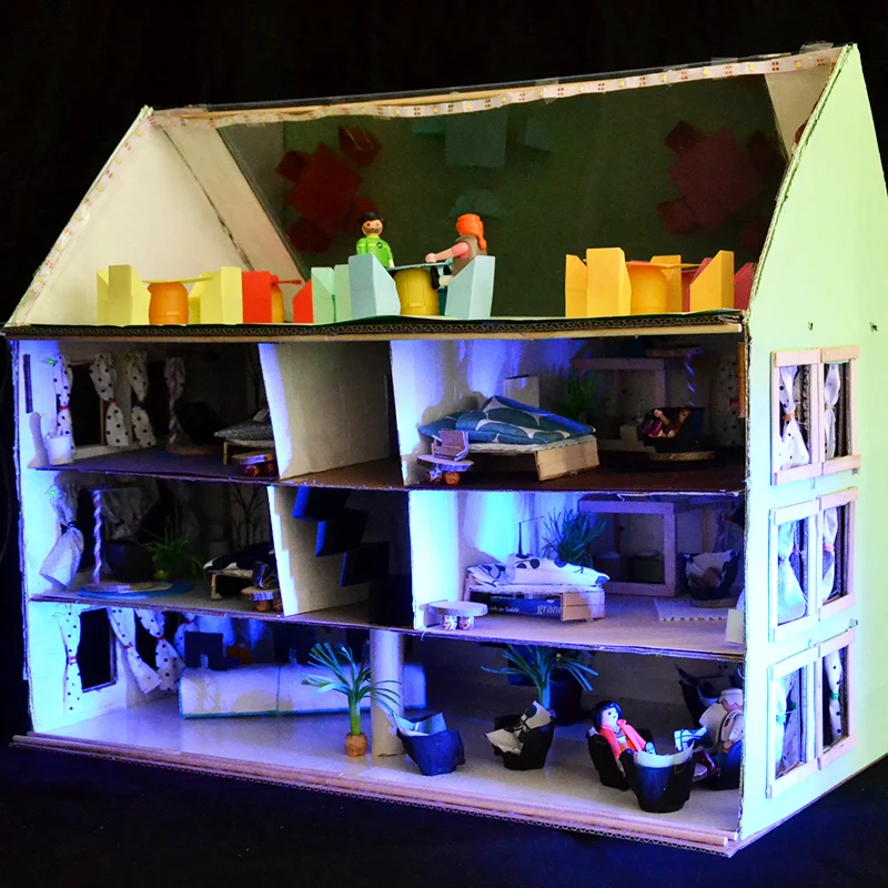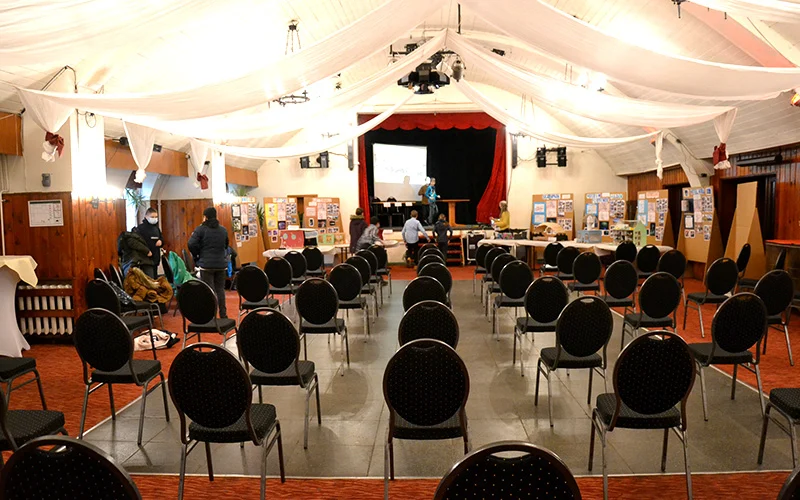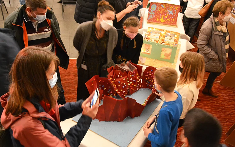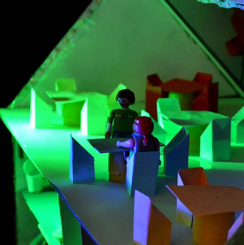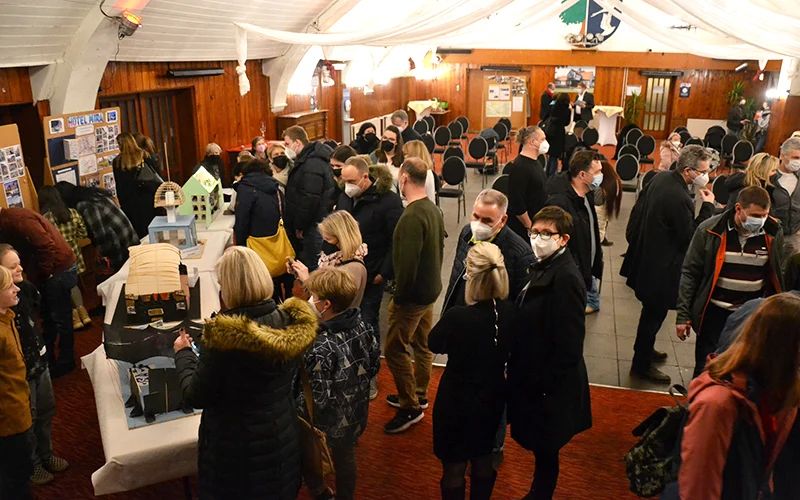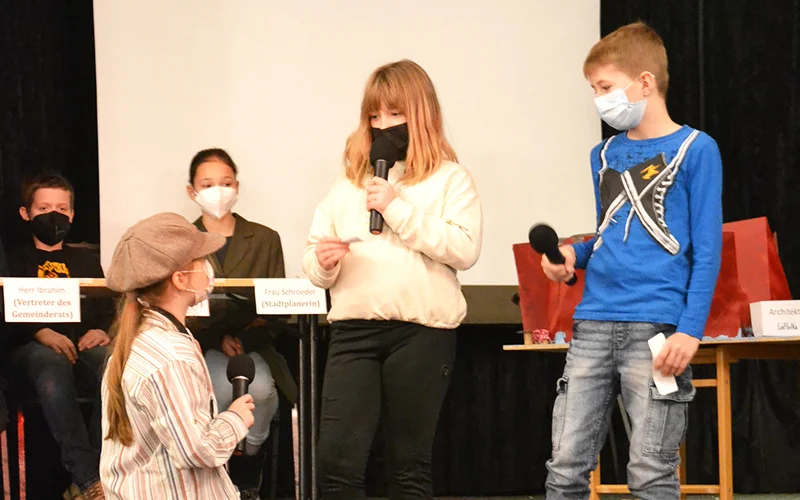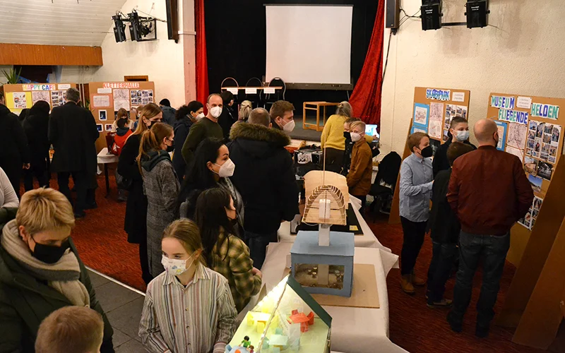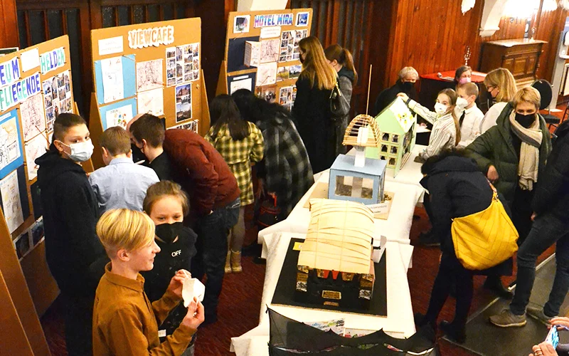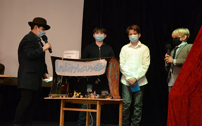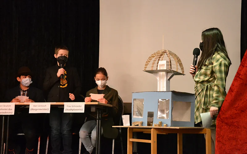 In der abschließenden öffentlichen Präsentation im Festsaal des Landgasthofs Schwanenkrug stellten die Schüler*innen vor über 60 Zuschauer*innen und dem Bürgermeister über ein Rollenspiel ihre Projekte vor. Ein fiktives Gremium aus Bürgermeister, Stadtplanerin, Vertreter*innen des Gemeinderats sowie einer MAZ-Reporterin kam zusammen, um sich von den 7 Architekt*innenteams, ihren Ideen und Entwürfen inspirieren zu lassen zu Visionen und Ideen für das ehemalige Fliegerhorstgelände im Erlenbruch.