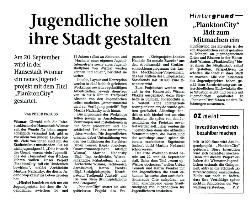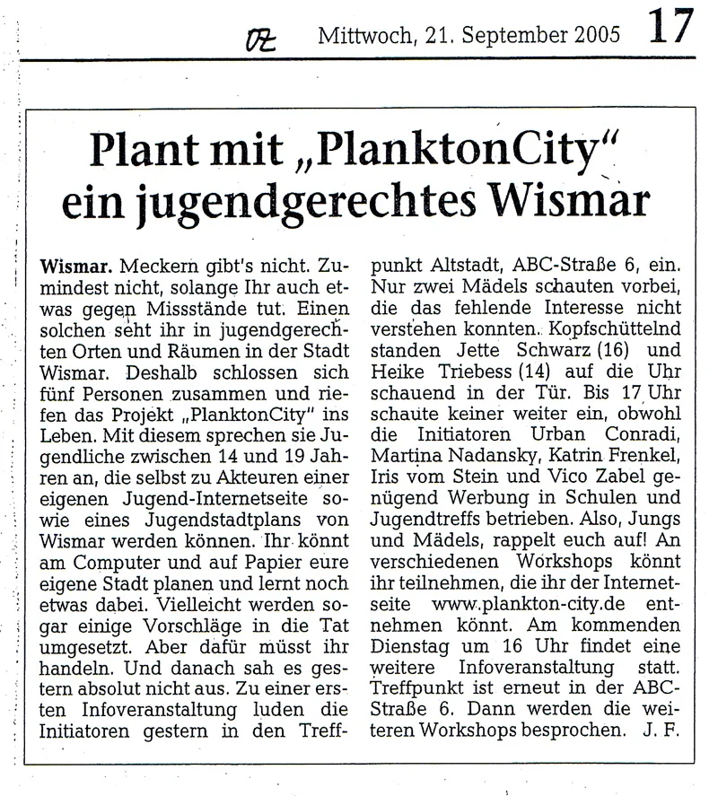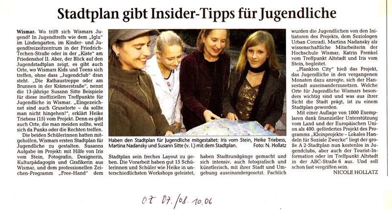 PlanktonCity ist ein partizipatorisches Jugendprojekt, bei dem Jugendliche zwischen ca. 14 und 19 Jahren selbst zu Akteuren und „Machern“ einer eigenen Jugend- Internetseite sowie eines Jugendstadtplans von Wismar 2005/06 wurden. Inhalte, Layout und Konzeption wurden in 4 fachlich geleiteten Workshops sowie in regelmäßigen Arbeitstreffen- jeweils dienstags von 16-18 Uhr im Treffpunkt Altstadt – von den Jugendlichen selbst erarbeitet.