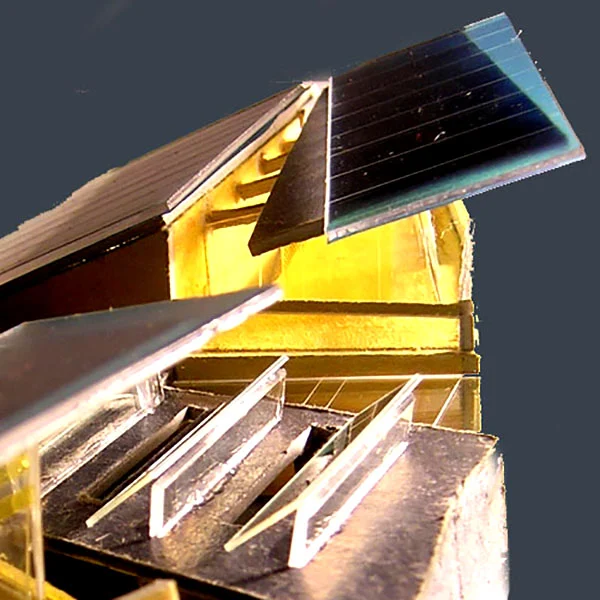 Wie die Flügel des Schmetterlings sind die Dächer der beiden Wohnflügel die Kollektorflächen. Der eigentliche Widerspruch zwischen der idealen Dachneigung zum Zweck der Modulanbringung einerseits und der Dachneigung (Baukörperorientierung) im Hinblick auf Energiegewinne und Verluste andererseits wird gelöst, indem der sich nach Norden öffnende Baukörper im Dachgeschoss als Puffer ausgebildet wird. Dadurch wird die kalte Nordfassade minimiert und zusätzlich Raum geschaffen für semitemperierte Atelierflächen, die sich funktional (Malkurse, Ausstellungen …) in das Kulturkonzept der Solarsiedlung einfügen.