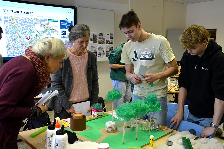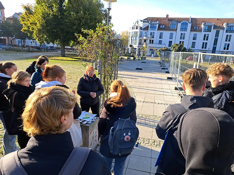 Der Stadtspaziergang sollte uns daher zu möglichst unterschiedlichen Orten in Falkensee führen, die auf ganz eigene Weise, in differenzierten Maßstäben und mit verschiedenen Methoden beispielhaft stadtökologisch transformiert werden können und somit vielfältige Projektideen bei den Schüler:innen anregen. Ganz besonders bereichernd war es, dass uns als Expertin die langjährige Leiterin des Stadtplaungsamtes Falkensee Frau Pollow durch die Stadt geführt und begleitet hat. Die Schüler:innen haben aus diesem Rundgang 8 Orte ausgewählt, die sie in 8 Gruppen bearbeitet haben.