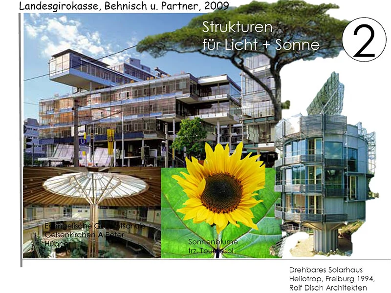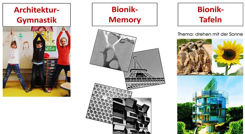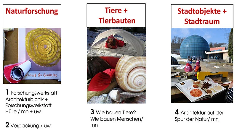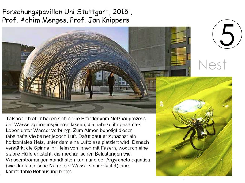 Architektur und Natur haben viele Gemeinsamkeiten, die oft ganz offensichtlich sind, die man aber manchmal auch erst auf den zweiten Blick erkennt. Konstruktion, Statik, Form, Farbe, Material, Wärme- und Wasserhaushalt…- dies sind Themen, die in Architektur UND Natur eine große Rolle spielen und ihren Ausdruck in gebauter Form finden. Alle Lebewesen- ob Mensch, Tier oder Pflanze- haben mit Umweltbedingungen zu tun, die zu vielfältigen und den jeweils angepassten Bauformen führen. Schutzfunktionen stehen dabei an erster Stelle. Der Schutz vor Witterung und Feinden, der Schutz von Nachkommen und Vorräten, sowie Schutz und Erwerb von Wärme und Wasser lassen sich in Architektur und Natur eindrucksvoll belegen – und eben vergleichen. Gut erkennbar sind beispielsweise konstruktive Gemeinsamkeiten, die auf dem Prinzip gleicher Konstruktionsbedingungen beruhen (Spinnennetz/ Zugkonstruktion, Muschel/ Betonschale, Knochenskelett/ Skelettbau, Grashalm/Turm). Aber auch die Umstände verschiedener Lebensformen und ihre daraus entwickelten Bauformen lassen sich vergleichen (Bienenstock/ Wabenbau, Ameisenhügel/ Passivhaus).